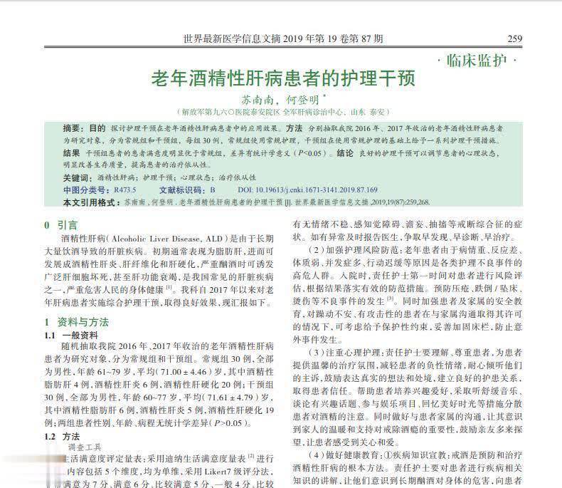 参考文献[1]苏南南,何登明.老年酒精性肝病患者的护理干预[J].世界最新医学信息文摘,2019,19(87):259+268.