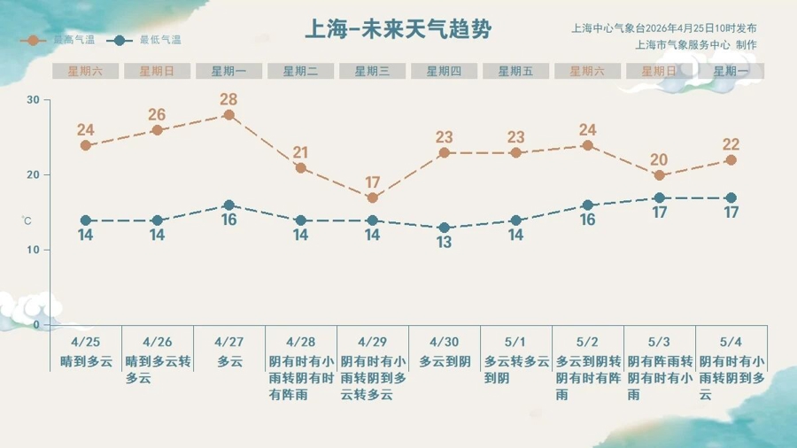 下周前期,暖意还将继续“加码”。预计下周一最高气温可达28℃,这将是近期气温的一个高点,午后甚至会有几分初夏的错觉。不过,春季天气向来“变脸”快,下周二至周三,随着新一股冷空气和暖湿气流交汇,本市又将迎来一次较明显的降雨和大风天气过程,气温也随之“跳水”,短短两三天,气温起伏如同“过山车”,周三最高气温仅有17℃。