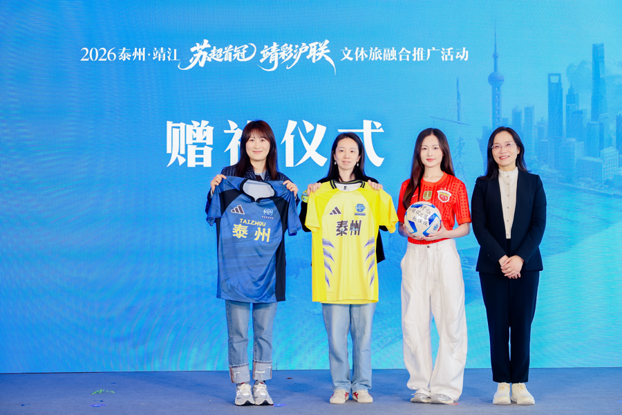 在苏超、靖江村超文旅产品赠予仪式环节,现场通过视频回顾了4月19日靖江村超揭幕战的火热场面。随后,靖江市政府副市长邵春宁向上海市民游客代表和旅行商代表赠送苏超泰州队球衣,并向上海球迷代表赠送靖江村超揭幕战足球,这颗签名足球不仅凝聚着揭幕战当天5000多名靖江球迷的激情,更传递出靖江的体育热情与文旅诚意。